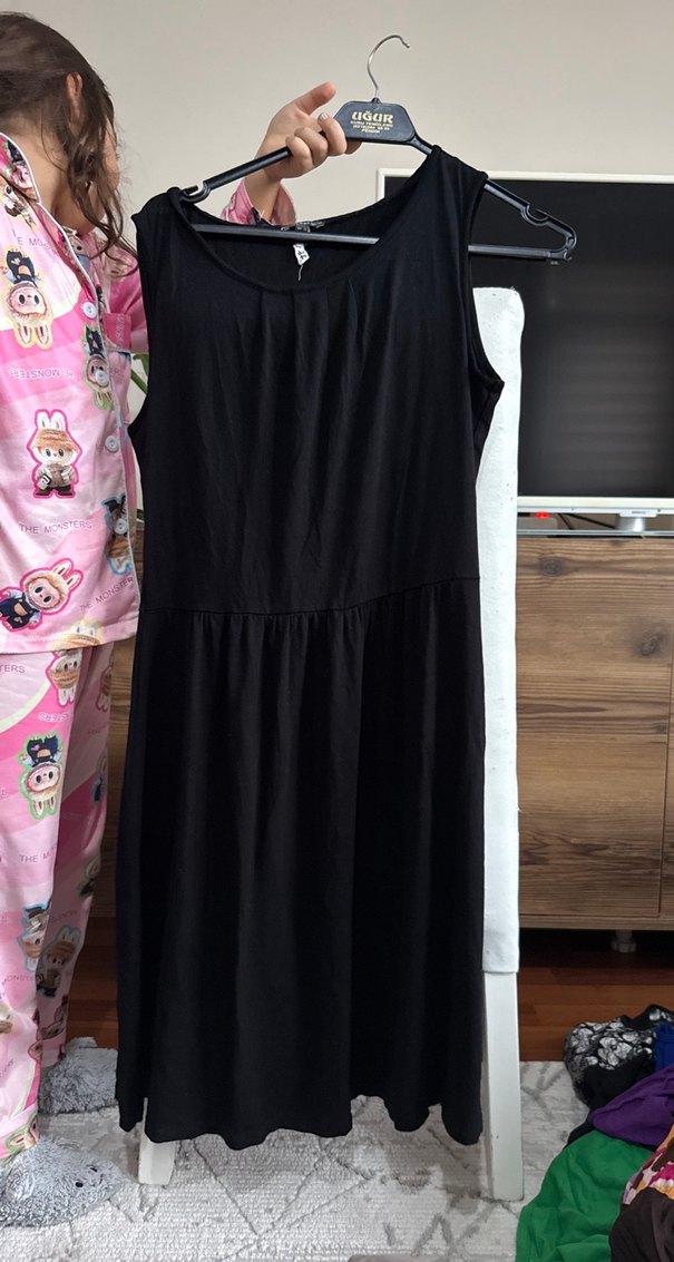 Siyah, askısız, drapeli bu hamile elbisesi, vücuda oturan kesimi ve midi boyuyla günlük kullanıma uygundur. Minimalist goth tarzındadır.