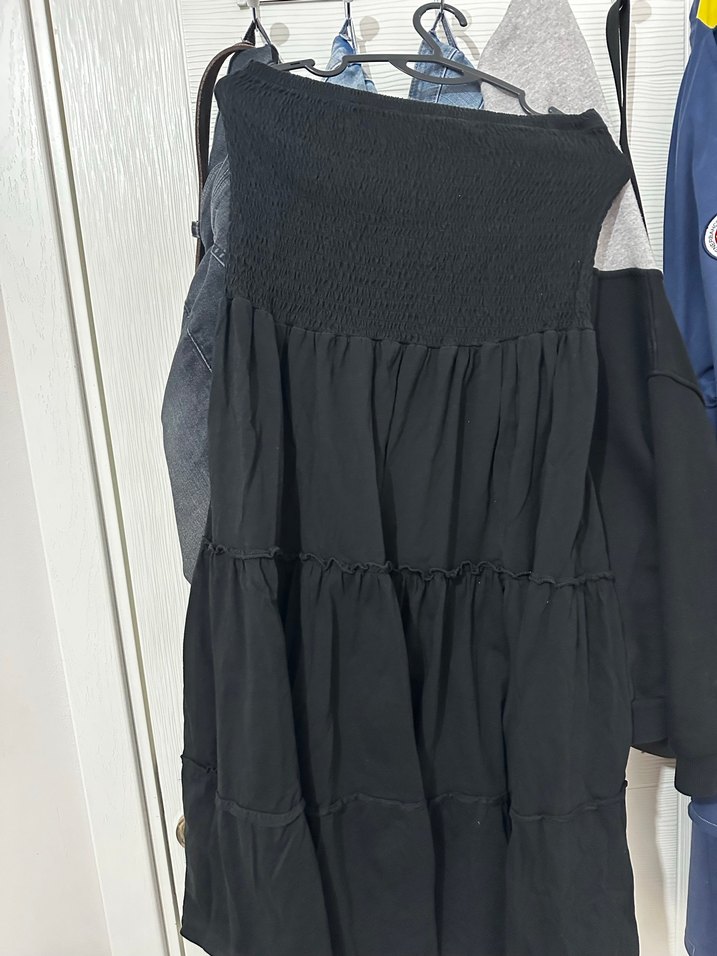 Siyah midi hamile eteği, bol kesim ve fırfır detayları ile rahat sentetik kumaştan günlük kullanım için uygundur.