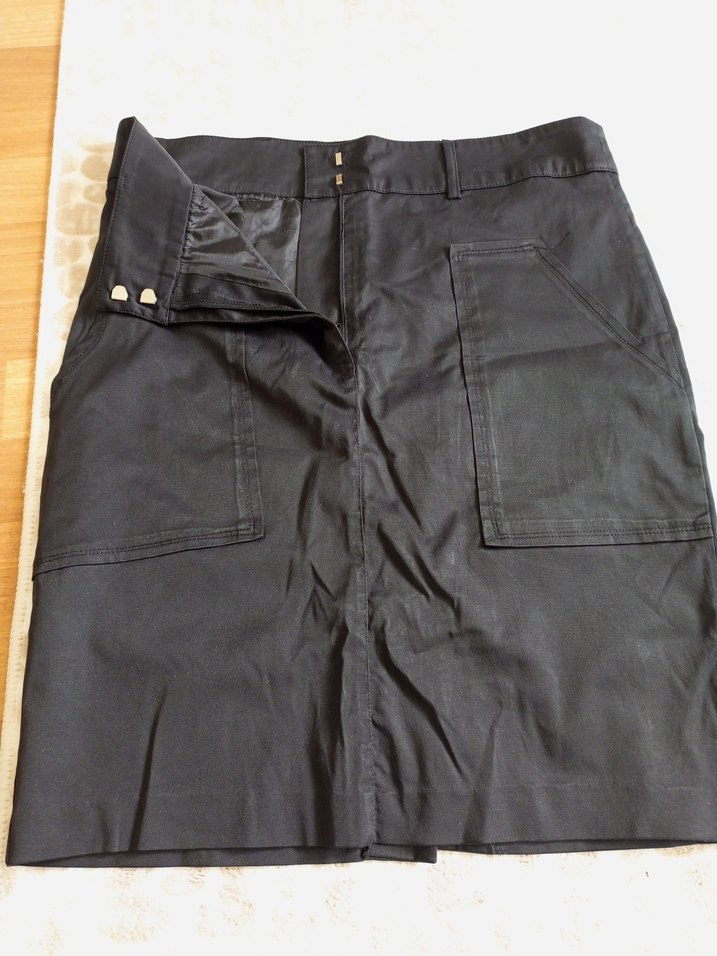 Siyah renkli, midi boy, kemerli ve saten dokulu etek ofis kullanımı için uygundur.