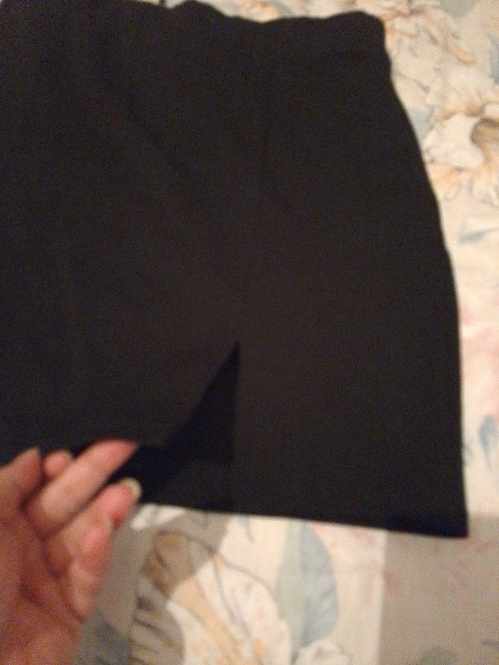 Siyah renkte, sentetik kumaştan yapılmış, yırtmaçlı ve vücuda oturan midi hamile eteği. Minimalist goth tarzıyla ofis için uygundur.
