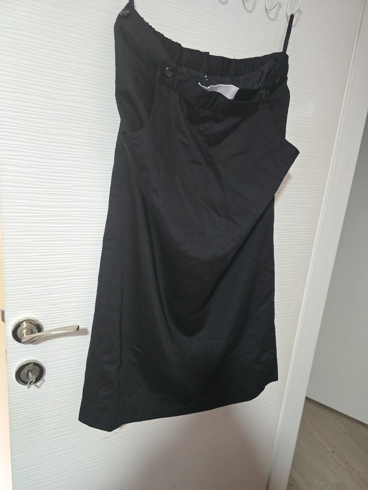 Siyah midi hamile eteği, salaş kesim ve drapeli detaylara sahiptir. Düz, sentetik kumaştan üretilmiş olup, günlük kullanıma uygun minimal ve normcore tarzındadır.