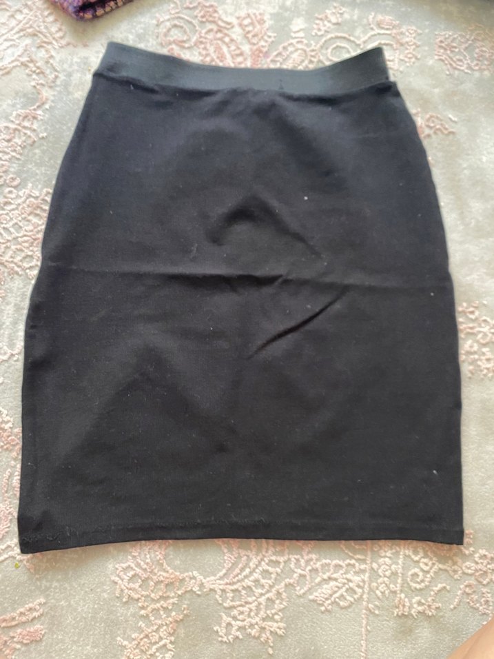 Siyah midi uzunluğunda, düz ve sıkı oturan hamile eteği, ofis için minimalist gotik tarzı yansıtır.