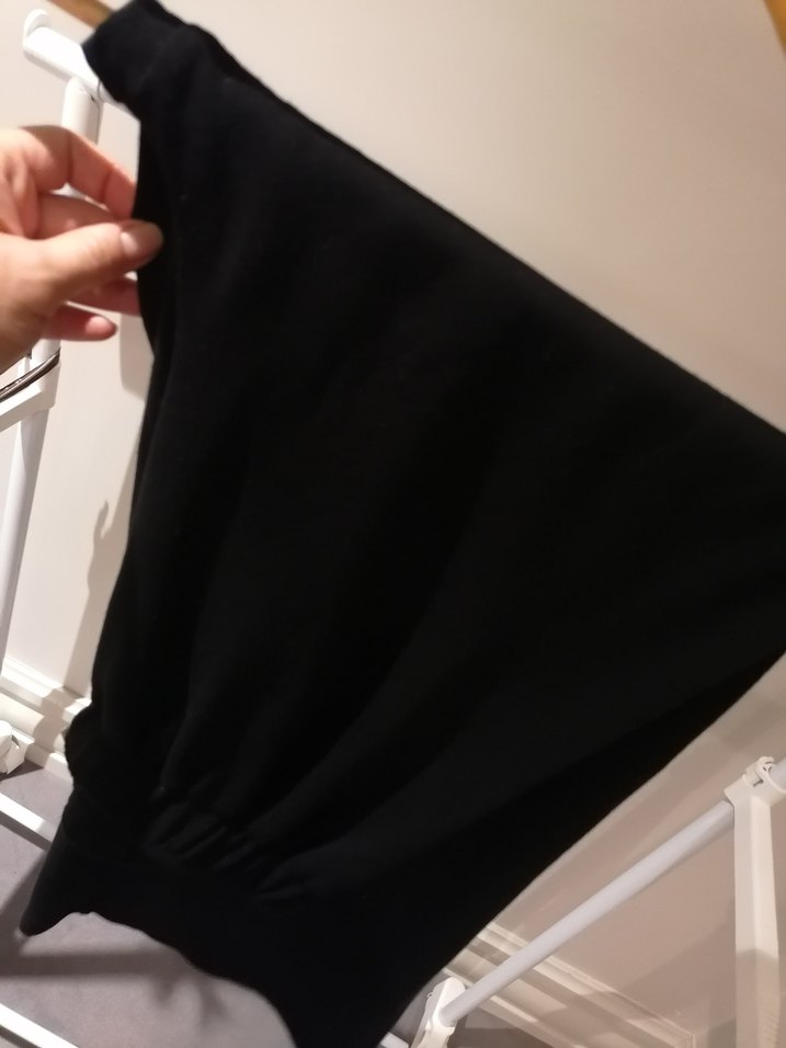 Siyah, vücuda oturan midi hamile eteği, yırtmaç detayı ve rahat sentetik kumaşıyla günlük kullanıma uygundur.