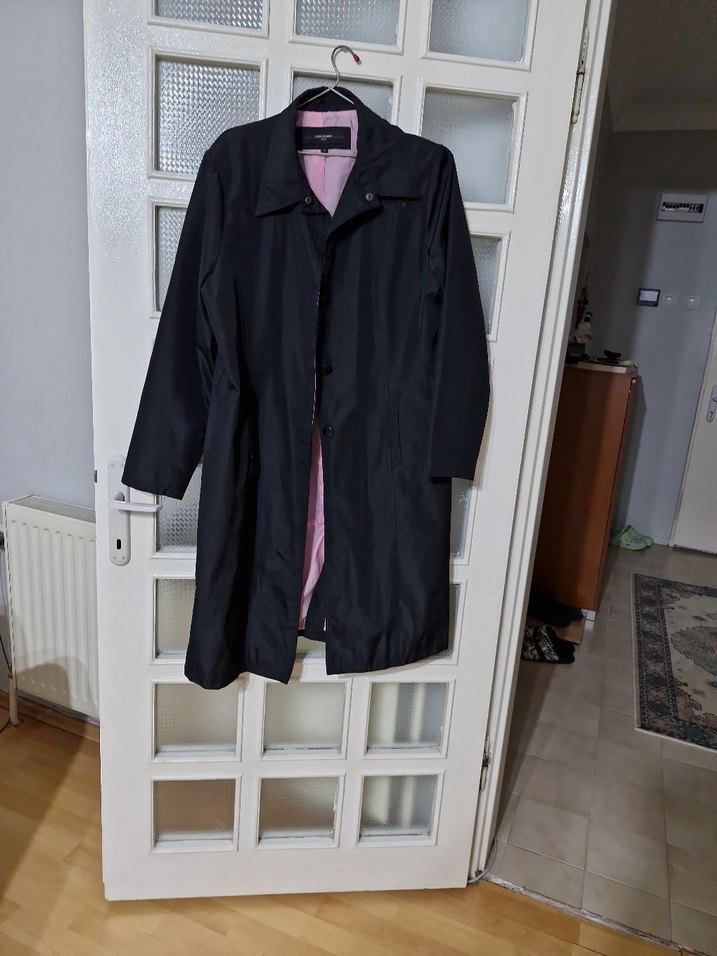 Siyah midi uzunlukta, düğmeli, regular fit hamile kabanı. Notch yaka ve uzun kolludur, ofis için uygundur.