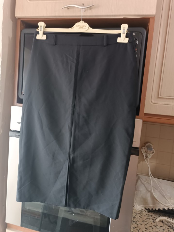 Siyah midi hamile kalem etek, kemerli ve rahat oturan kesime sahip, ofis için uygun sentetik kumaştan yapılmıştır.