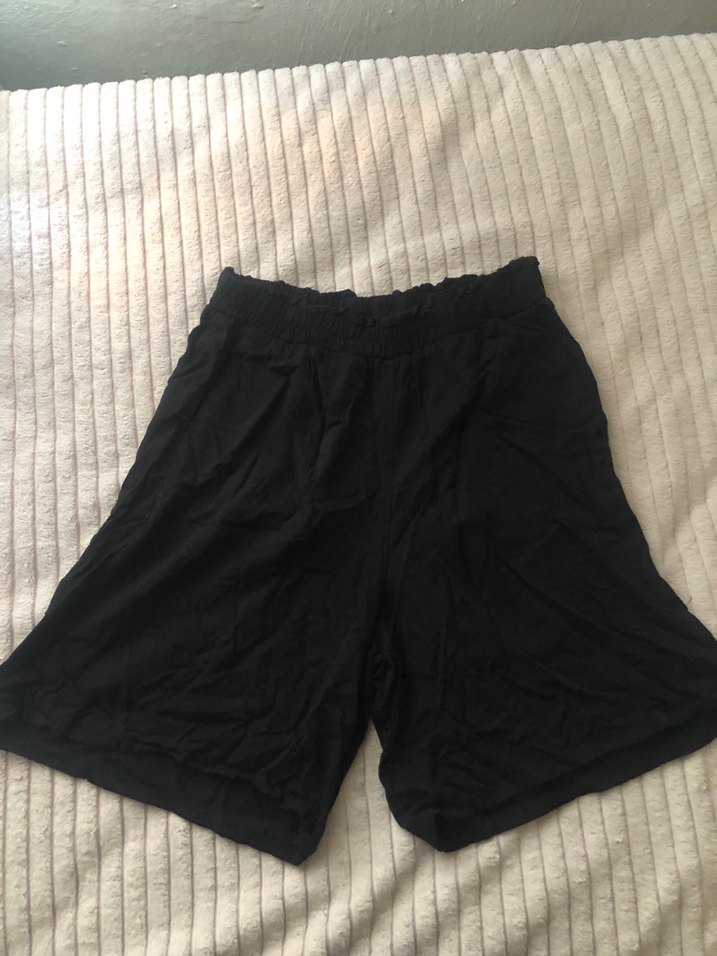 Nefes alabilen keten kumaştan, bol kesim ve lastikli bel detaylı siyah midi hamile şort. Günlük rahat kullanım için uygundur.