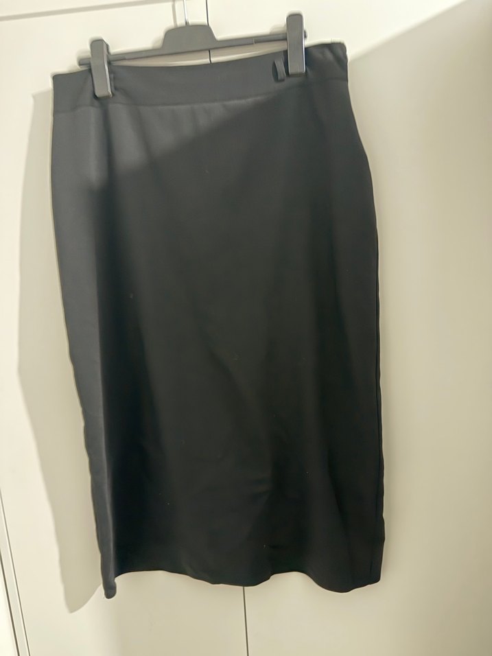 Siyah midi uzunlukta, düz desensiz hamile eteği. Sentetik kumaştan yapılmış, rahat kesim ve ofis tarzına uygun sade tasarım.