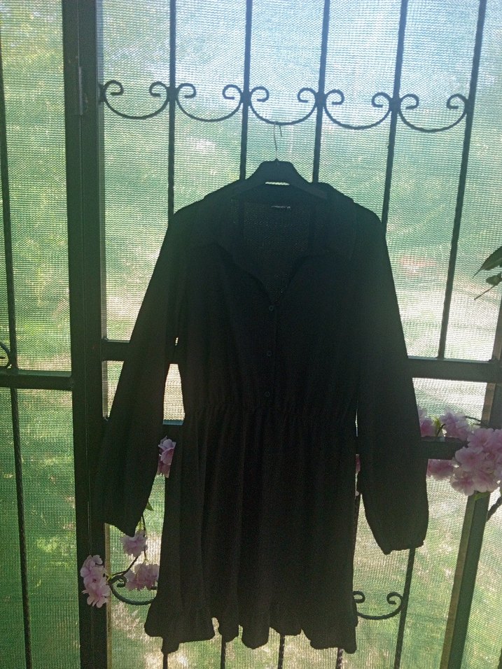 Siyah midi boy, dökümlü hamile paltosu. Uzun kollu, notalı yaka ve sentetik kumaştan, gotik ve avant-garde tarzda dış mekan kullanımı için uygun.