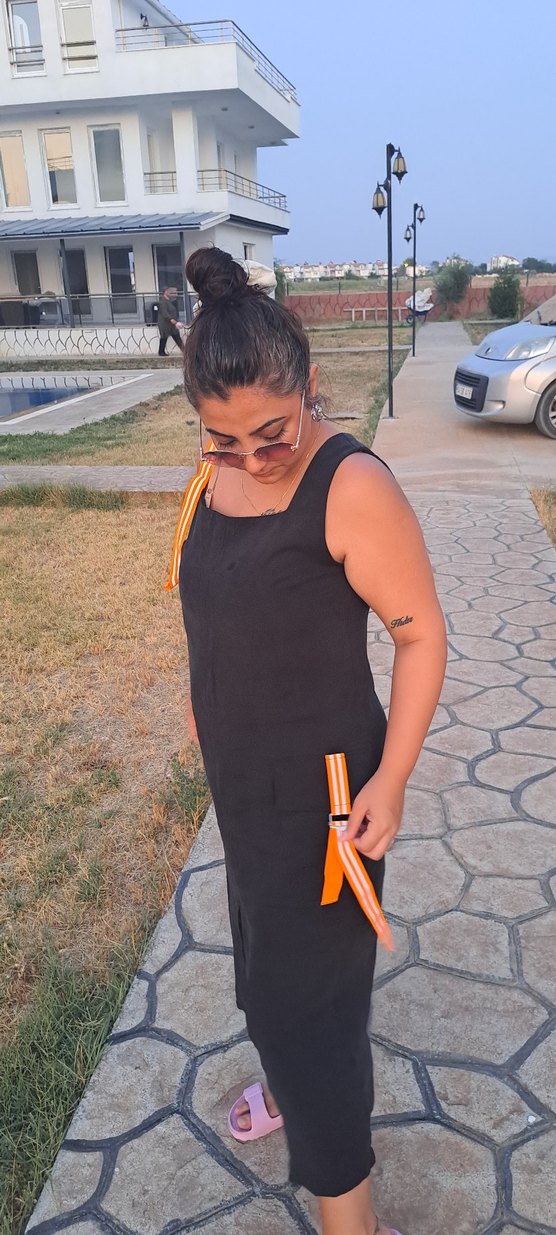 Siyah midi hamile elbise halter yaka ve kolsuz tasarımıyla, yırtmaç detayı ve bol kesimiyle rahat bir kullanım sunar. Günlük sokak stili için uygundur.