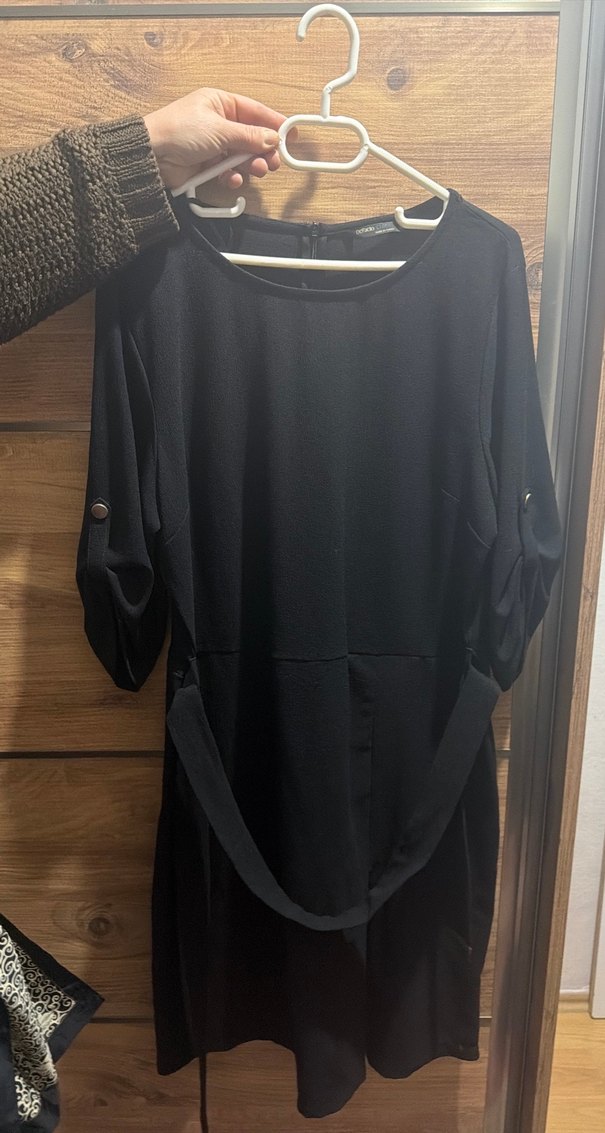 Siyah midi uzunluğunda hamile tunik, yuvarlak yaka ve düğmeli uzun kollara sahiptir. Kemerli ve bol kesimdir, ofis kullanımı için uygun sentetik kumaştan üretilmiştir.