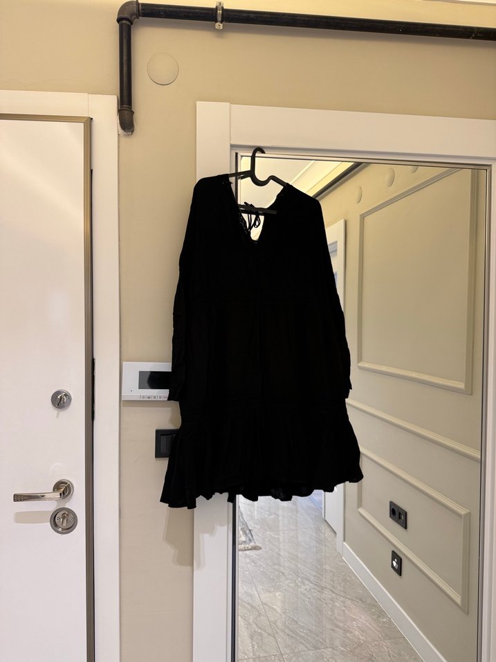 Siyah midi uzun kollu hamile tunik, V yakalı ve bol kesim, dökümlü tasarım, yumuşak keten kumaştan, günlük kullanıma uygun gotik tarzda. Büyük beden için uygun