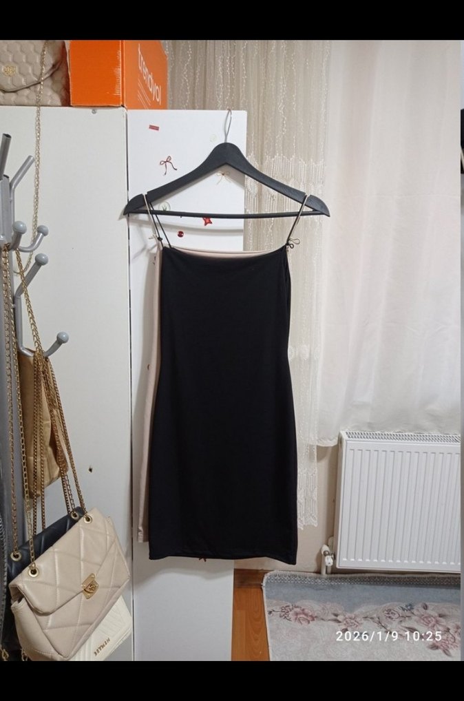 İnce askılı siyah midi elbise, rahat ve şık bir günlük kullanım sunar. 90 cm uzunluğunda s,m giyer