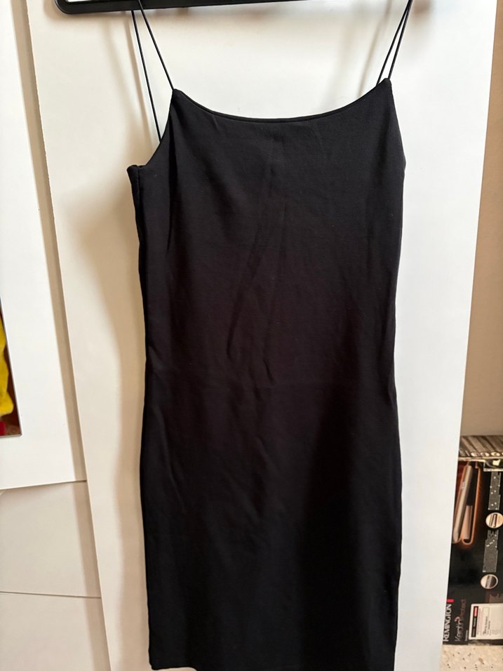 İnce askılı, tek renk siyah midi elbise, tekne yaka ve vücuda oturan kesimiyle sade ve gotik stil sunar. Romantik akşamlar için uygundur.