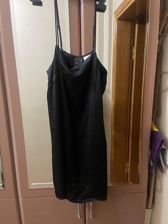 Siyah, ipek görünümlü, askılı midi elbise; drapeli ve vücuda oturan kesimiyle romantik akşamlar için uygundur. H&M yeni ve etiketlidir hiç giyilmedi.