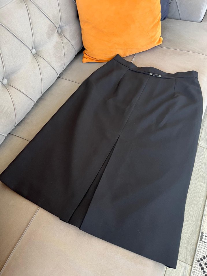 Siyah midi boy,yırtmaçlı, düz desenli, sentetik kumaştan yapılmış kadın eteği. Ofis ortamına uygun, rahat kesim.