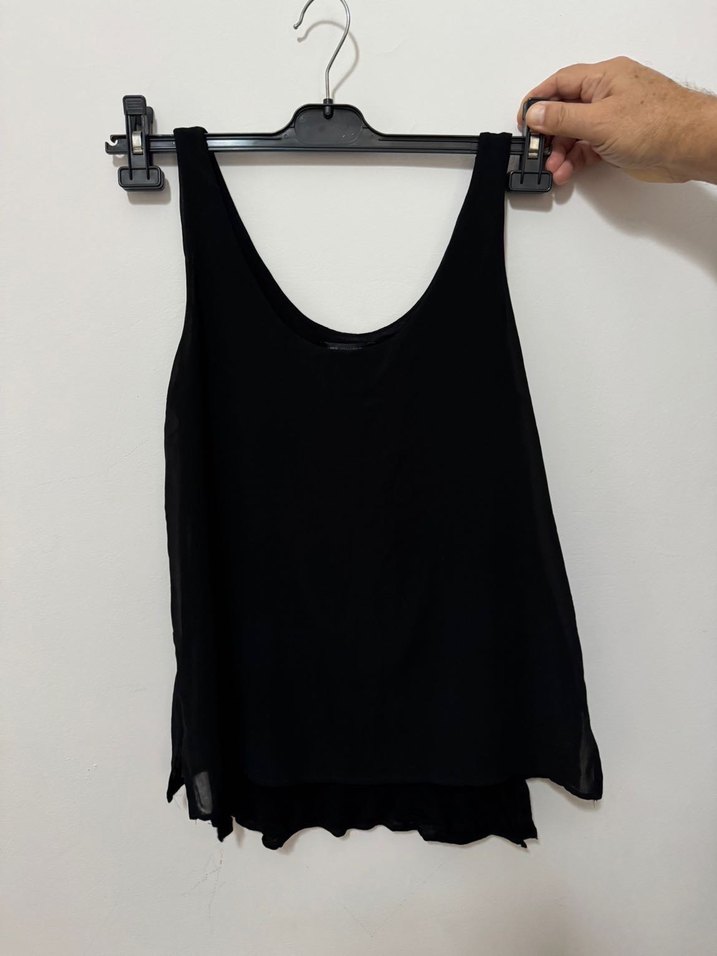 Siyah, kolsuz, yuvarlak yakalı ve bol kesim midi kadın atlet. Sentetik kumaştan, minimalist goth tarzında ve günlük kullanıma uygun.