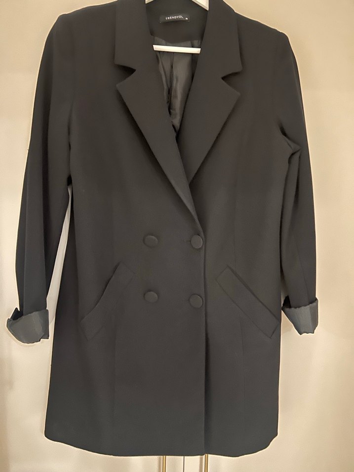 Siyah midi uzunlukta, düğmeli, kesik yakalı ve uzun kollu kadın blazer ceket. Ofis için ideal, ipeksi dokulu ve klasik kesim.