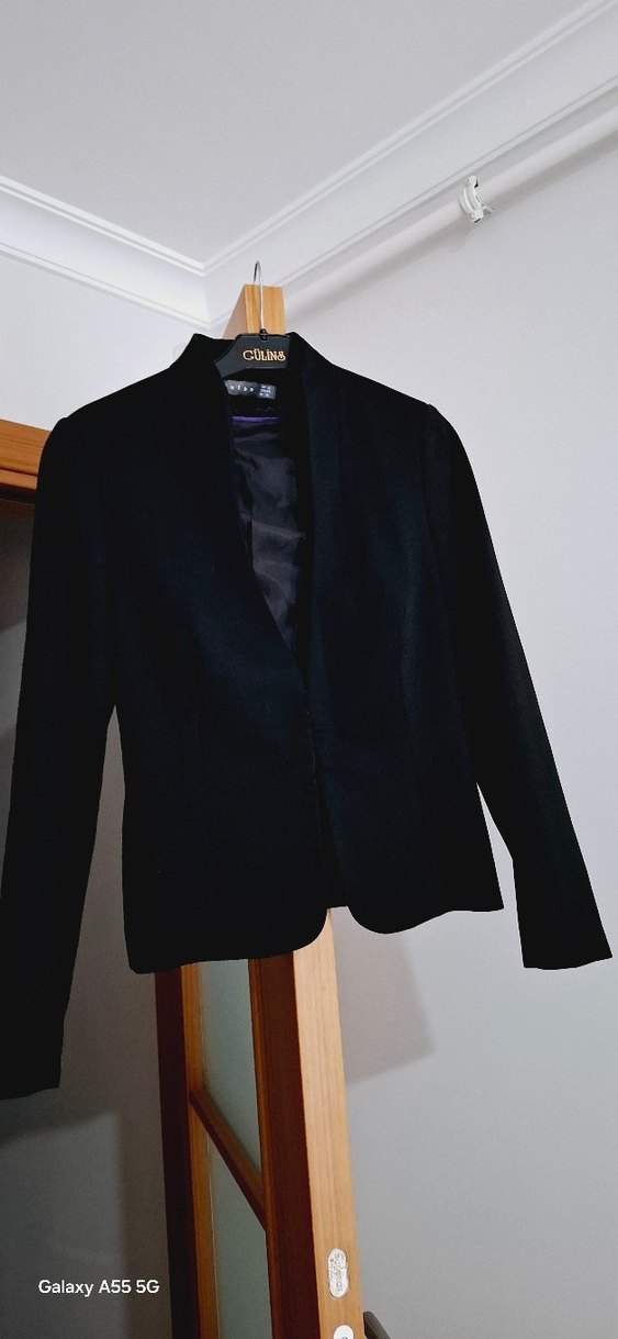 Siyah midi uzunlukta, düğmeli ve yakalı kadın blazer ceketi, klasik şıklık için ipeksi dokuda, uzun kollu ve regular fit.