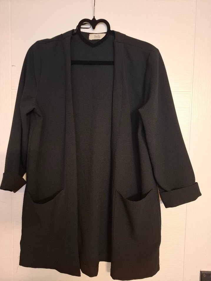 Siyah midi uzunlukta kadın ceket, kesik yaka ve uzun kollu. Rahat oturan, minimalist ve normcore tarzda, ofise uygun sade şıklık sunar. İki ön cep bulunur.