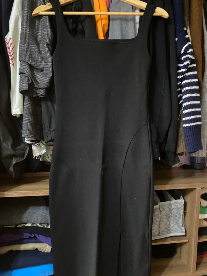 Siyah midi uzunlukta, kolsuz, kayık yaka ve drapeli detaylara sahip, vücuda oturan çelik kumaş elbisedir. ,