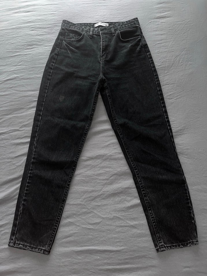 Düz siyah, midi boy, regular fit kadın denim pantolon. Minimalist tarzda, günlük kullanıma uygun rahat kesim.