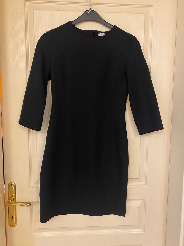 Siyah, midi boy, kısa kollu, yuvarlak yakalı, vücuda oturan kadın triko elbise. Yumuşak sentetik kumaştan, minimalist ve gotik tarzda, ofis için uygun.