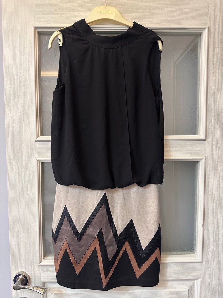 Kolsuz, v yaka üst kısmı siyah şifon etek kısmı süet ve geometrik desenli deri detaylı midi kadın elbisesi. Ofis kullanımı düğün nişan vs. için uygun. Orjinal marka