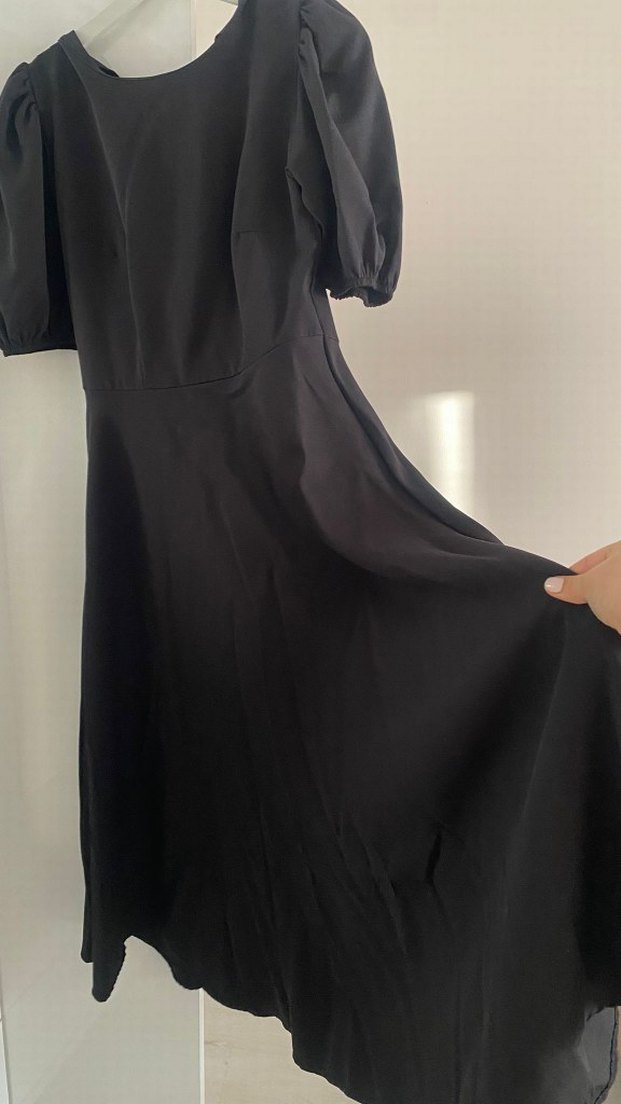 M-L UYUMLU Siyah midi uzunlukta, kısa kollu,drapeli ve vücuda oturan kadın elbisesi. Ofis için uygun, minimalist gotik tarzda, ipeksi dokuda.