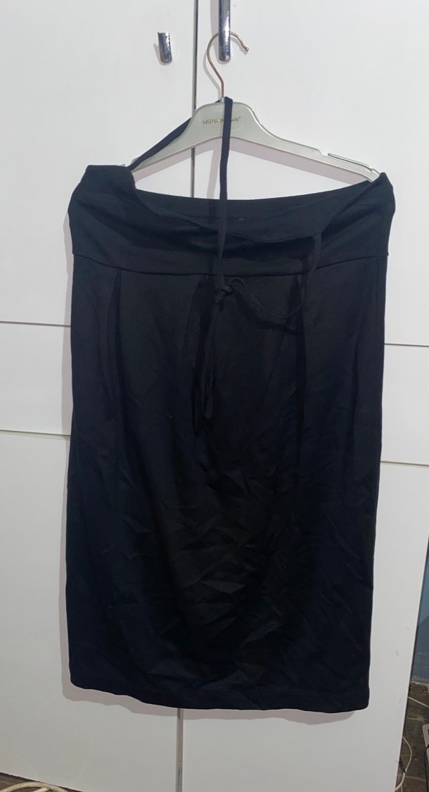 Kemer detaylı, ince kumaştan yapılmış siyah midi uzunlukta, dar kesim kadın elbisesi . Ofis için minimalist gotik tarzda.