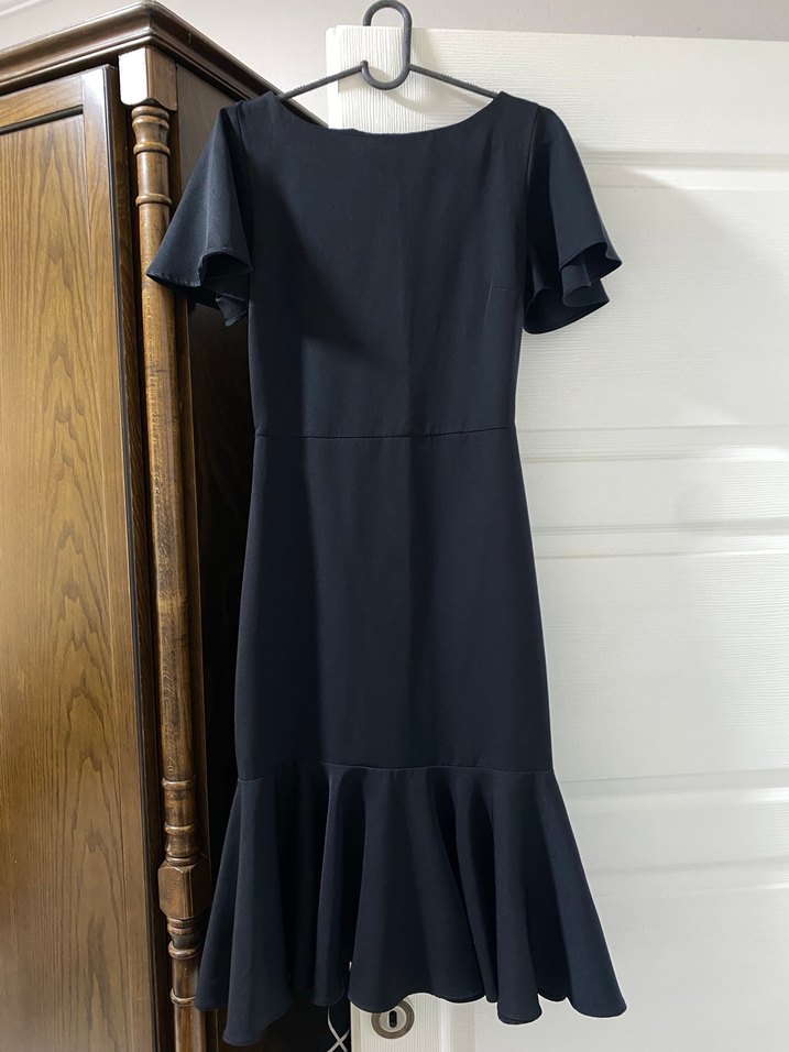 Kısa kollu, yuvarlak yakalı siyah midi elbise, normal kesim ve etek kısmında fırfır detaylı. Ofis için modern klasik tarzda şık bir seçim.