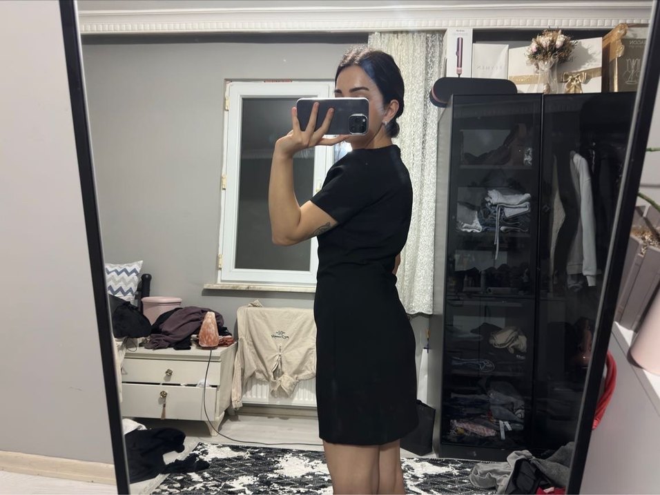 Kısa kollu ve yüksek yakalı, vücuda oturan siyah midi elbise. Düz, sentetik kumaştan, minimalist ve zahmetsiz şıklık sunar.