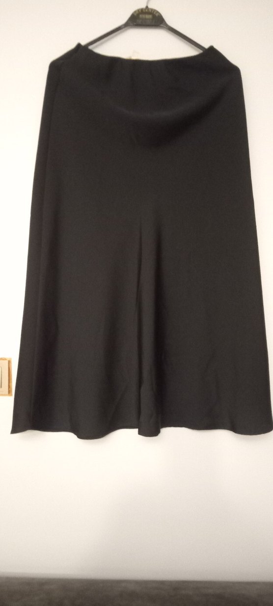 Siyah midi uzunlukta, salaş kesim ve ipeksi dokulu kadın eteği. Minimalist, desen içermeyen, ofis için uygun sade ve şık görünümlü.