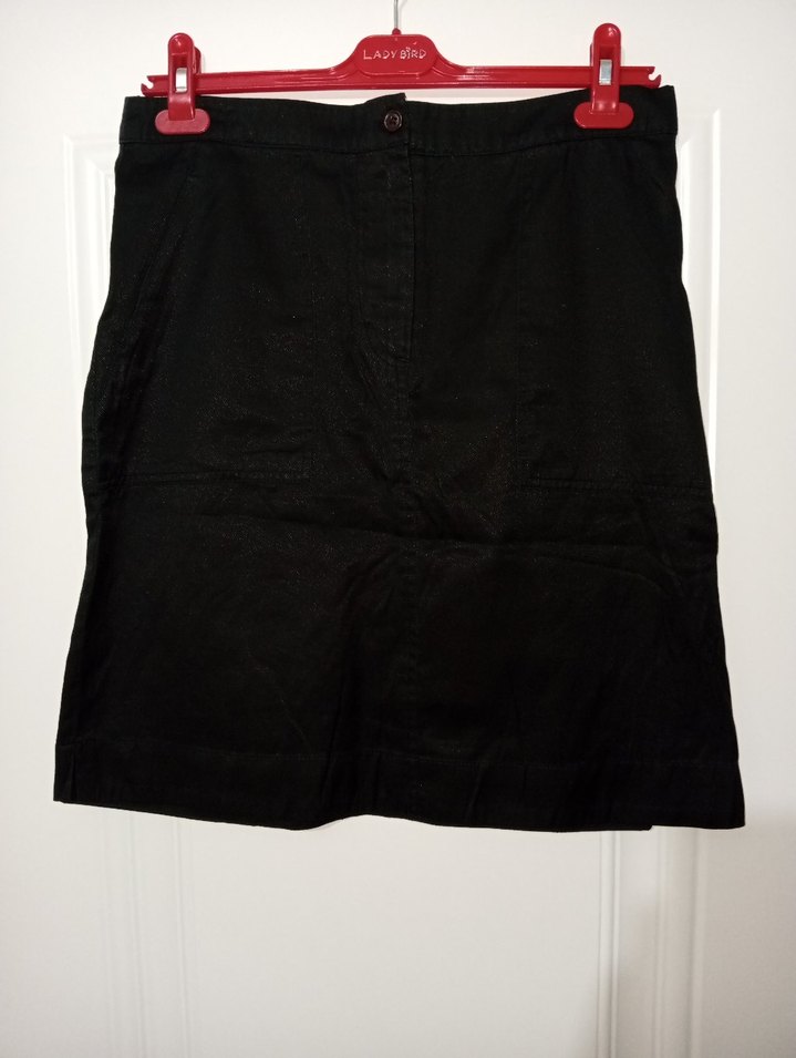 Siyah midi kadın eteği, rahat kesim ve ipeksi dokusuyla minimalist ve gotik tarz sunar. Ofis kullanımı için uygun, desen içermeyen sade tasarım. beden 40 boyu 55 beli 43 cm