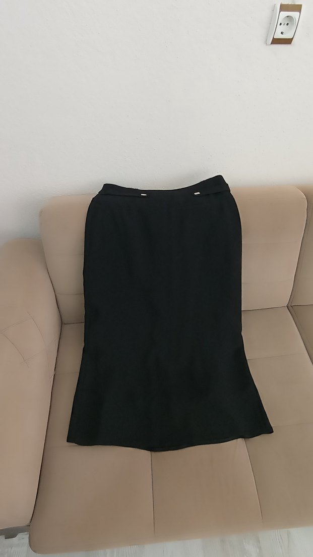 Siyah, vücuda oturan midi etek, ipeksi dokusu ve minimalist gotik tarzıyla öne çıkar. Ofis için şık ve avant-garde bir görünüm sunar.