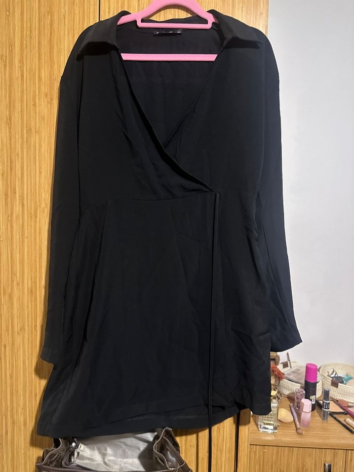 Siyah midi uzunlukta, bol kesim ve uzun kollu, minimalist gotik tarzda kadın gömlek elbisesi. Desensiz sade tasarıma sahiptir. Çok güzel bir elbise ama maalesef dekoltesi beni rahatsız etti. İpi var ama lastikli değil.