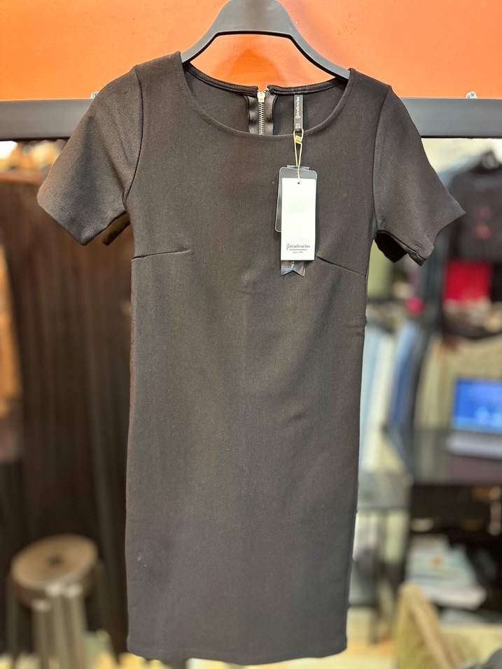 Kısa kollu, yuvarlak yakalı siyah midi elbise. Düz ve rahat kesimli, pürüzsüz sentetik kumaştan üretilmiştir. Günlük kullanıma uygundur.