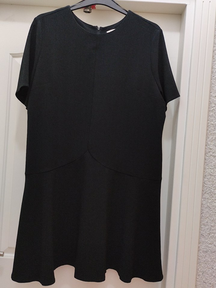 Kısa kollu, yuvarlak yakalı siyah midi elbise, bol kesim ve drapeli detaylara sahiptir. Pürüzsüz sentetik kumaştan üretilmiş, minimalist ve normcore tarzıyla ofis için uygundur.