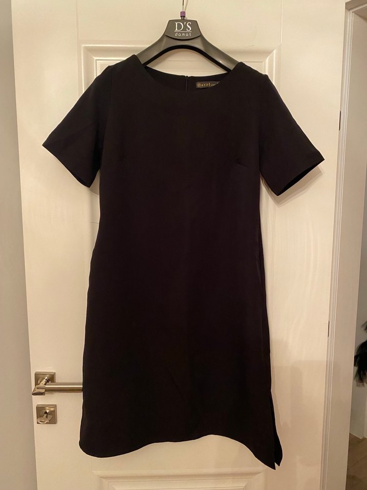 Siyah midi elbise, kısa kollu, yuvarlak yakalı ve bol kesimdir. İpeksi kumaştan yapılmış, minimal ve rahat şıklık sunar. Romantik akşamlar için uygundur.