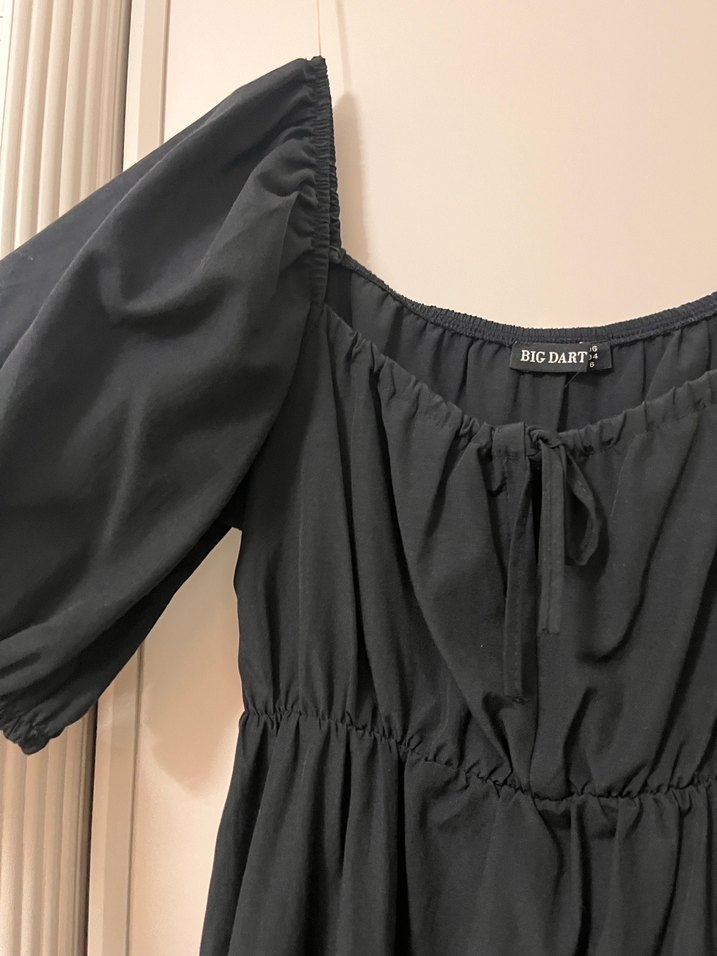 Siyah midi elbise, teknikli yakası ve fırfır detaylarıyla dikkat çeker. Rahat kesimi ve sentetik kumaşıyla minimalist ve şık bir görünüm sunar. Günlük kullanıma uygundur. ✨