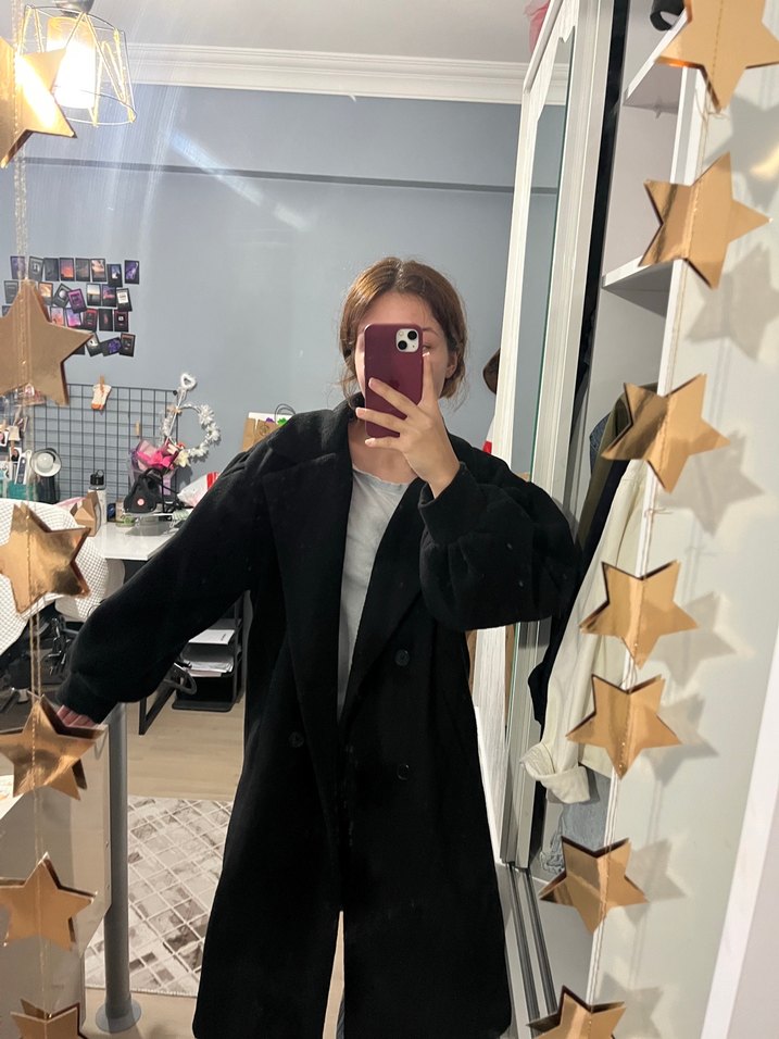 Siyah midi kaban, bol kesim ve yakalıdır. Yumuşak ve sıcak kumaştan üretilmiş, günlük kullanıma uygundur bazı yerlerde hafif tüylenmeler var her kaban da olduğu gibi göze batmıyor az giyildi 36 38 bedene Oversize olur 40 bedene tam olur gibi kendi bedeni 40-42