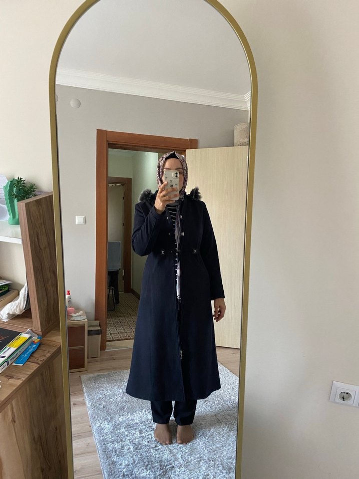 Siyah midi uzunlukta kadın kaban, kürk detaylı yakaya sahip. Uzun kollu, normal kesim ve yumuşak, sıcak tutan kumaştan üretilmiştir. Bikaç kez giyildi deforme yoktur kalıbı dar kalıp 40 bedene daha rahat olabilir
