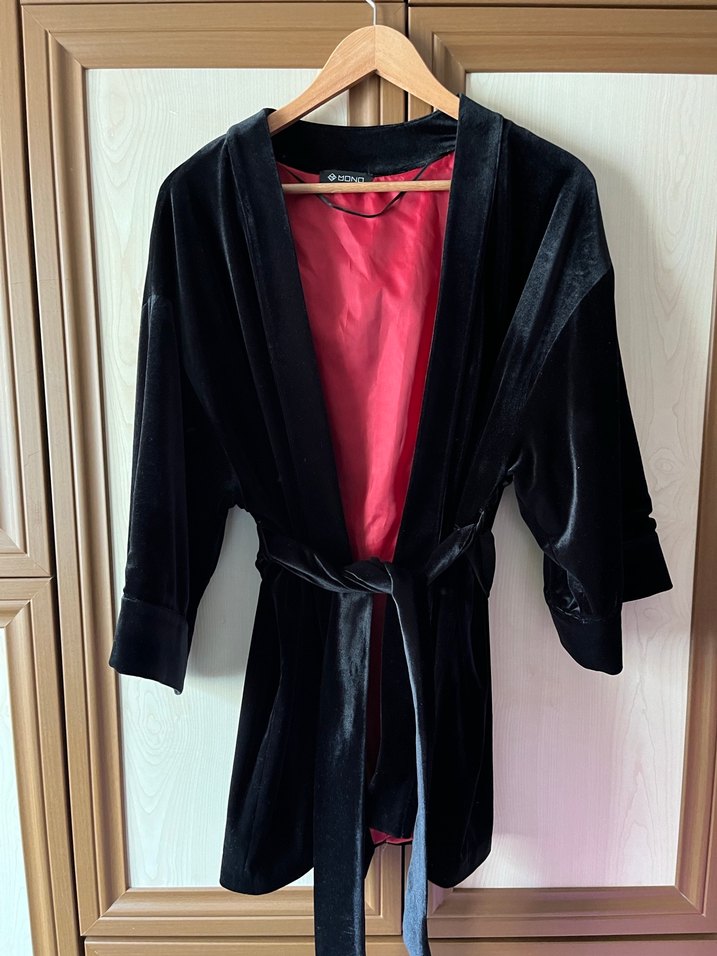 Siyah midi uzunlukta kadın kimono kruvaze yaka ve bol kesim ile drapeli ipekimsi kadife kumaştan yapılmıştır.ve kemeri vardır, şık bir seçim.