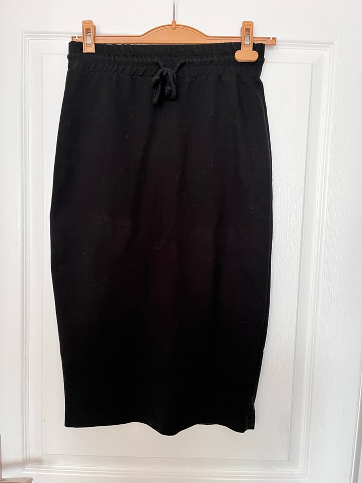 Siyah renkli, belden bağlamalı, düz ve kalem kesim midi etek, ofis kullanımı için minimal ve rahat bir tarz sunar. Basen 44 cm boy belden 75 cm bel lastik