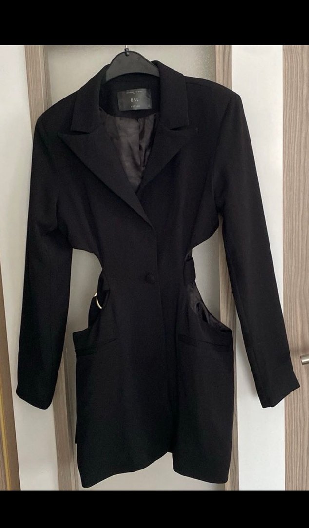 Siyah Midi Kadın Kemerli Ofis Kabanı