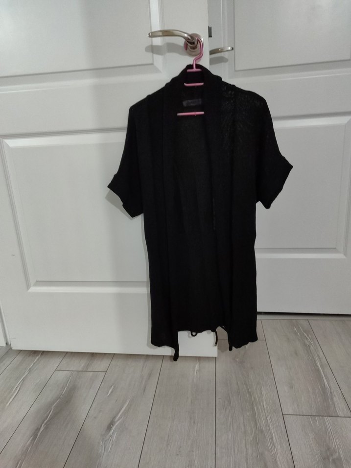 Siyah midi uzunluğunda, keten kumaştan, yakalı ve kısa kollu, rahat kesimli kadın hırkasıdır. Desensiz ve sade tasarımıyla günlük kullanıma uygundur.