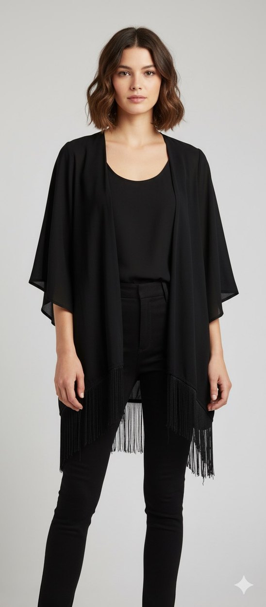 Kadınlar için drapeli, salaş kesim, uzun kollu ve V yakalı siyah midi kimono. İpeksi dokusu ve minimalist gotik tarzıyla günlük kullanıma uygun.