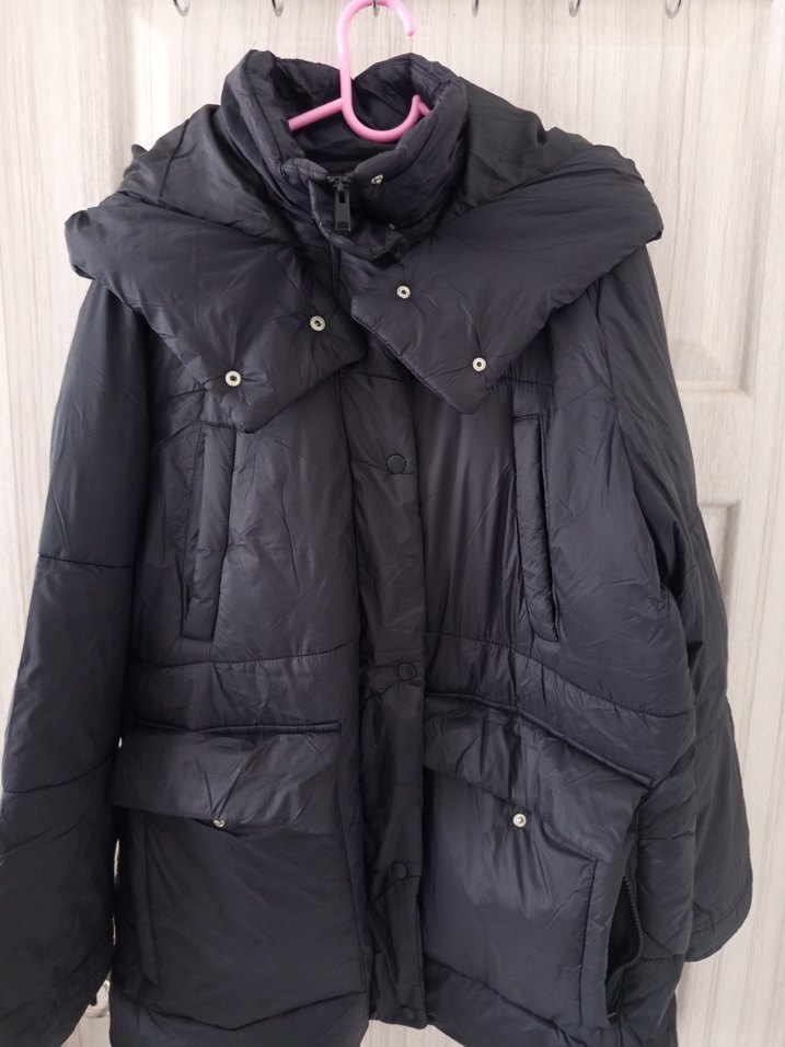 Siyah, midi boy kadın kışlık mont düğmeli ön, kesik yaka ve uzun kolludur. Sentetik kumaştan, bol kesim ve rahat sokak stiliyle günlük kullanıma uygundur.