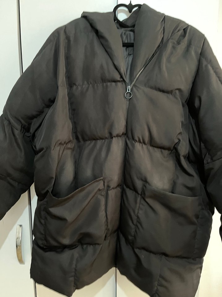 Siyah midi boy kadın kışlık mont, fermuarlı ve kesik yaka detaylıdır. Bol kesim, askılı kollar ve iki büyük ön cep içerir. Yumuşak ve sıcak kumaştan üretilmiştir. Bedeni yok M beden için uygundur