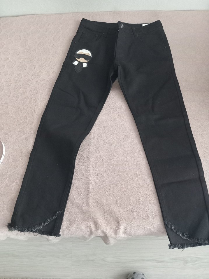 Siyah denim kumaştan, regular fit ve midi boy kot pantolon. Paça detayları ve küçük nakışlı desen içerir. Günlük kullanıma uygundur.