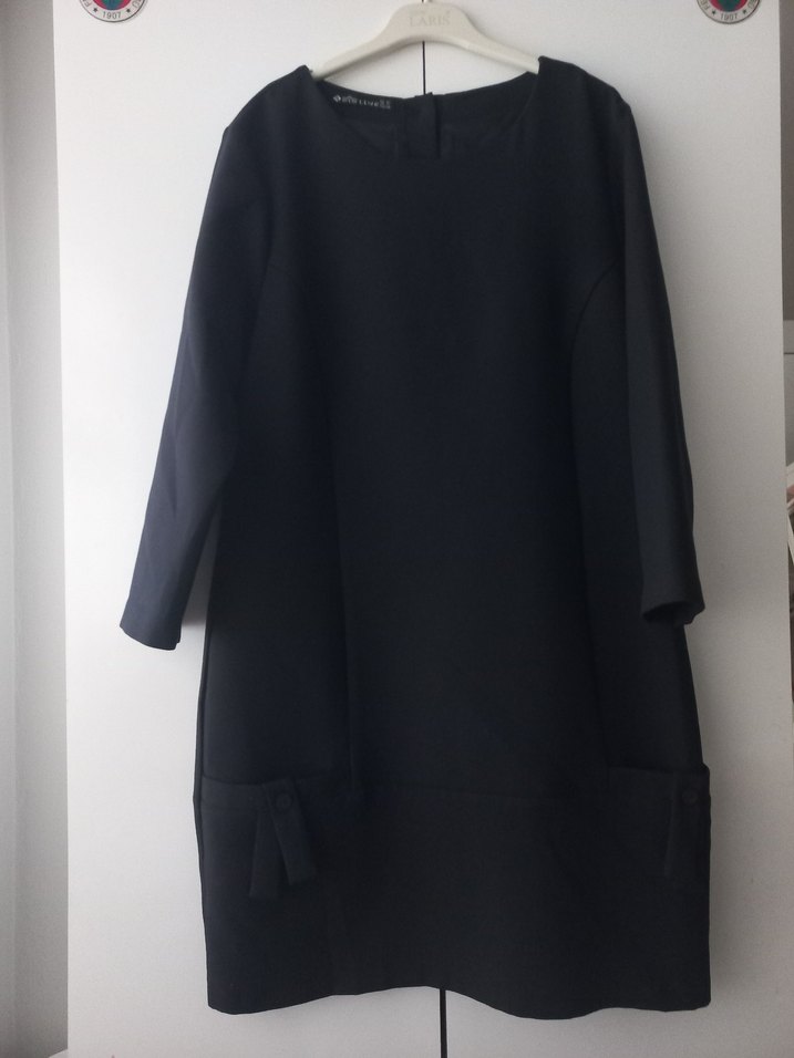 Siyah midi uzunlukta, uzun kollu, bisiklet yakalı, düz ve minimalist tasarımlı kadın kumaş elbise. Rahat kalıplı, günlük kullanıma uygun, yumuşak sentetik pamuklu kumaştan üretilmiştir.diz altındadır. rengi telefon sıkıntısından dolayı güzel çıkmadı rengi ve modeli harikadır arkası düğmelidir 3 tane düğme vardır